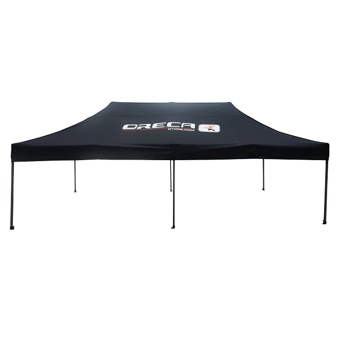 Toit 100% étanche en nylon polyester 300D (extrêmement solide et léger), traité au retardant anti-feu, sérigraphié ORECA.